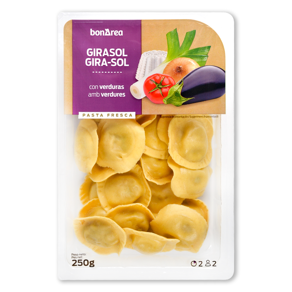 Producto fresco elaborado partiendo de los dos componentes principales: obleas de pasta fresca al huevo a partir de sémola y harina de trigo, huevo y agua, el relleno de berenjena, queso ricotta, cebolla, tomate, puerro, patata, y sal, se puede combinar con queso rallado o con nuestras salsas bonÁrea como la salsa cuatro quesos, bolonyesa o carbonara, o condimentar al gusto con aceite de oliva mantequilla, queso rallado bonÀrea mozzarella, para fundir, en polvo o emmental, etc.