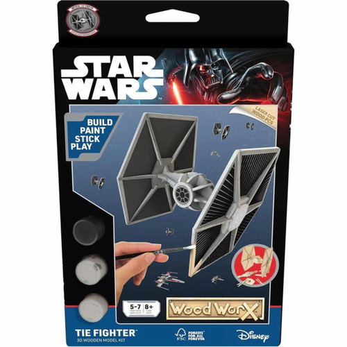 Kit de modelo 3D de madera Star Wars Wood Worx TIE Fighter para construir, pintar y decorar esta emblemática nave. Incluye piezas precortadas, pinturas, pincel y pegamento para crear tu propia réplica y disfrutar del universo Star Wars.