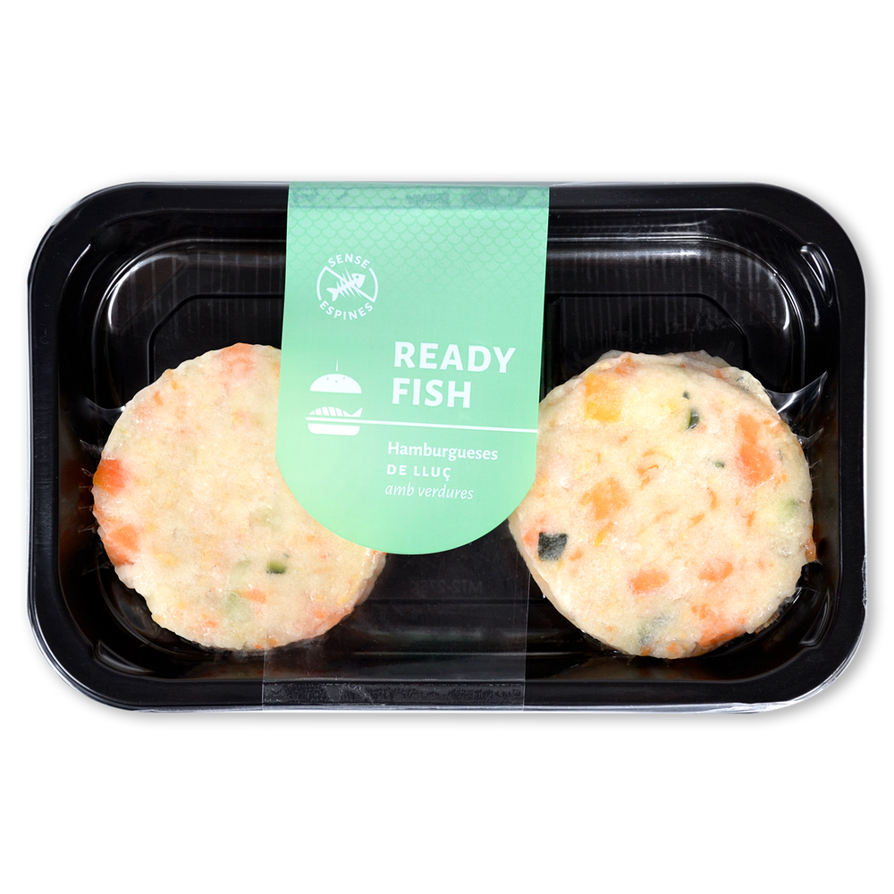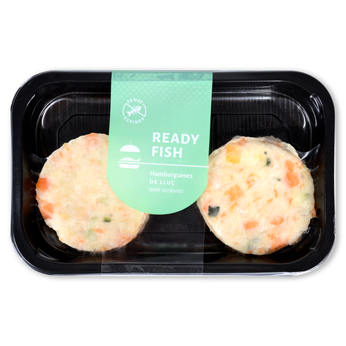 Hamburguesa hecha a partir de Merluza (60%) y de verdura (Calabacin, Calabaza y proteina de Guisante).