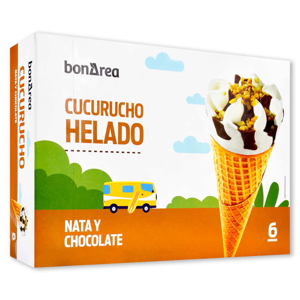 Cucurucho sabor nata y chocolate, con crujiente galleta. En cada pack hay 6 unidades. Delicioso refresco para los calurosos días de verano y unos atractivos postres para el invierno.