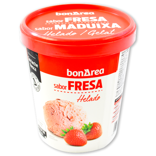 Helado de fresa. Hecho con leche fresca. Con trocitos de fresa (13%). Delicioso refresco para los calurosos días de verano y unos atractivos postres para el invierno.