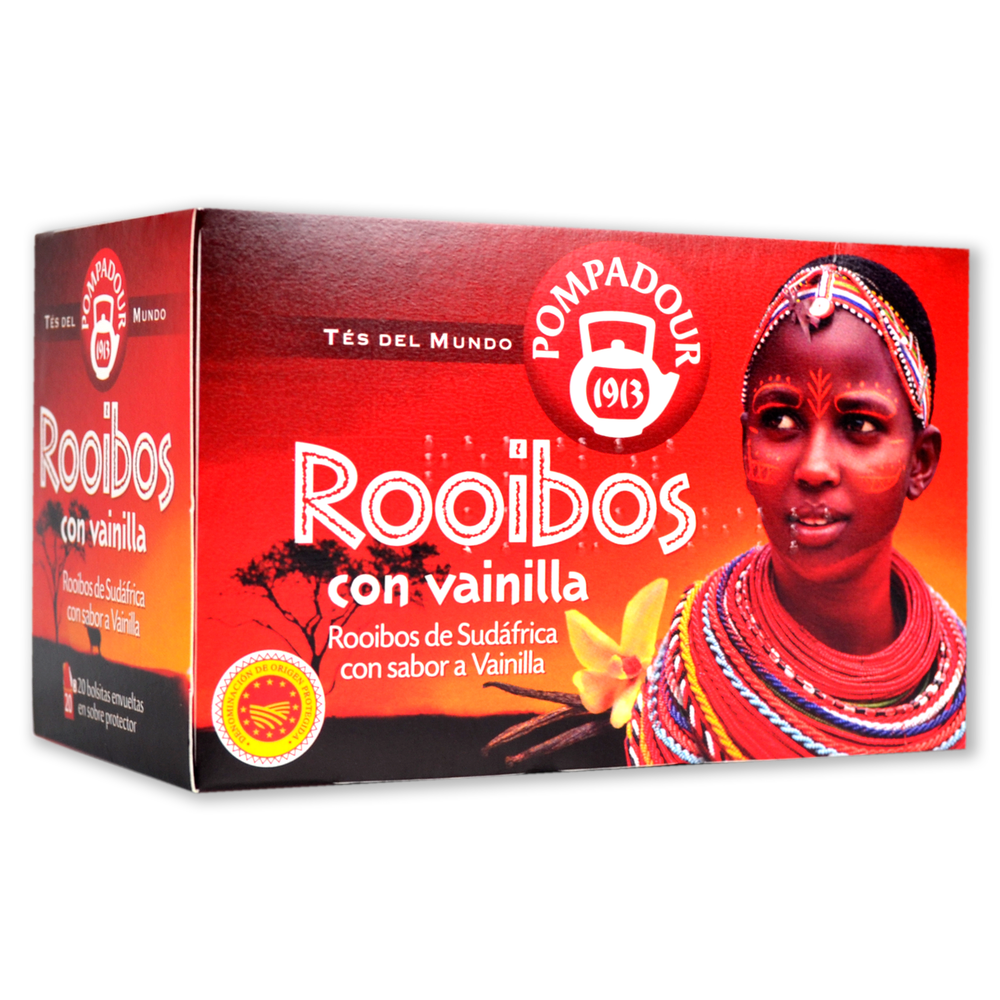 Disfrute del delicioso sabor del Rooibos con vainilla de Pompadour. Una infusión elaborada con el Rooibos que proviene de la región ubicada en los alrededores de las montañas Ceder (Sudáfrica) y que aún se cultiva en esa zona.ve y aromático combina exquisitamente con la vainilla. Es ideal tanto para adultos como para niños, no contiene cafeína.