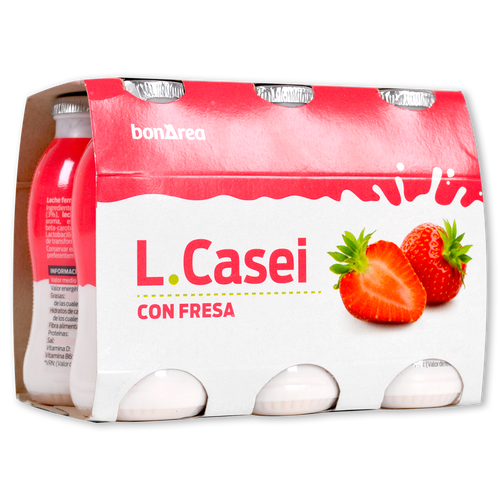 Bebida de leche fermentada que contiene, entre otros, L-Casei. El producto es el resultado de una mezcla de leche fresca pasteurizada, leche en polvo, azúcar y aroma de fresa. Después de una pasteurización se le adicionan fermentos lácticos para que se produzca la fermentación.