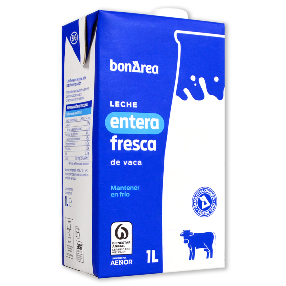 Leche pasteurizada entera bonÀrea en formato de 1 litro. Una propuesta para todas las personas que quieren disfrutar de una leche con todo su sabor y aroma. Dispone de un máximo de 29 días de vida útil.