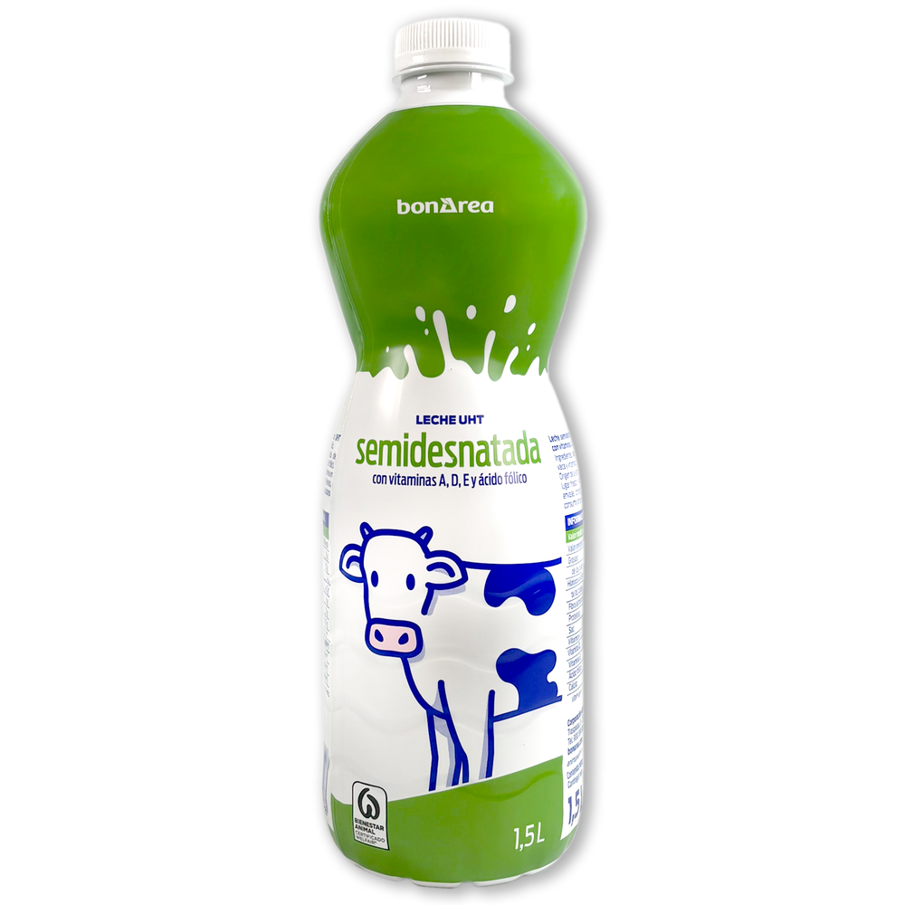 Leche semidesnatada UHT envasada en bricks de 1,5 l. Se presenta en paquetes de 6 bricks.