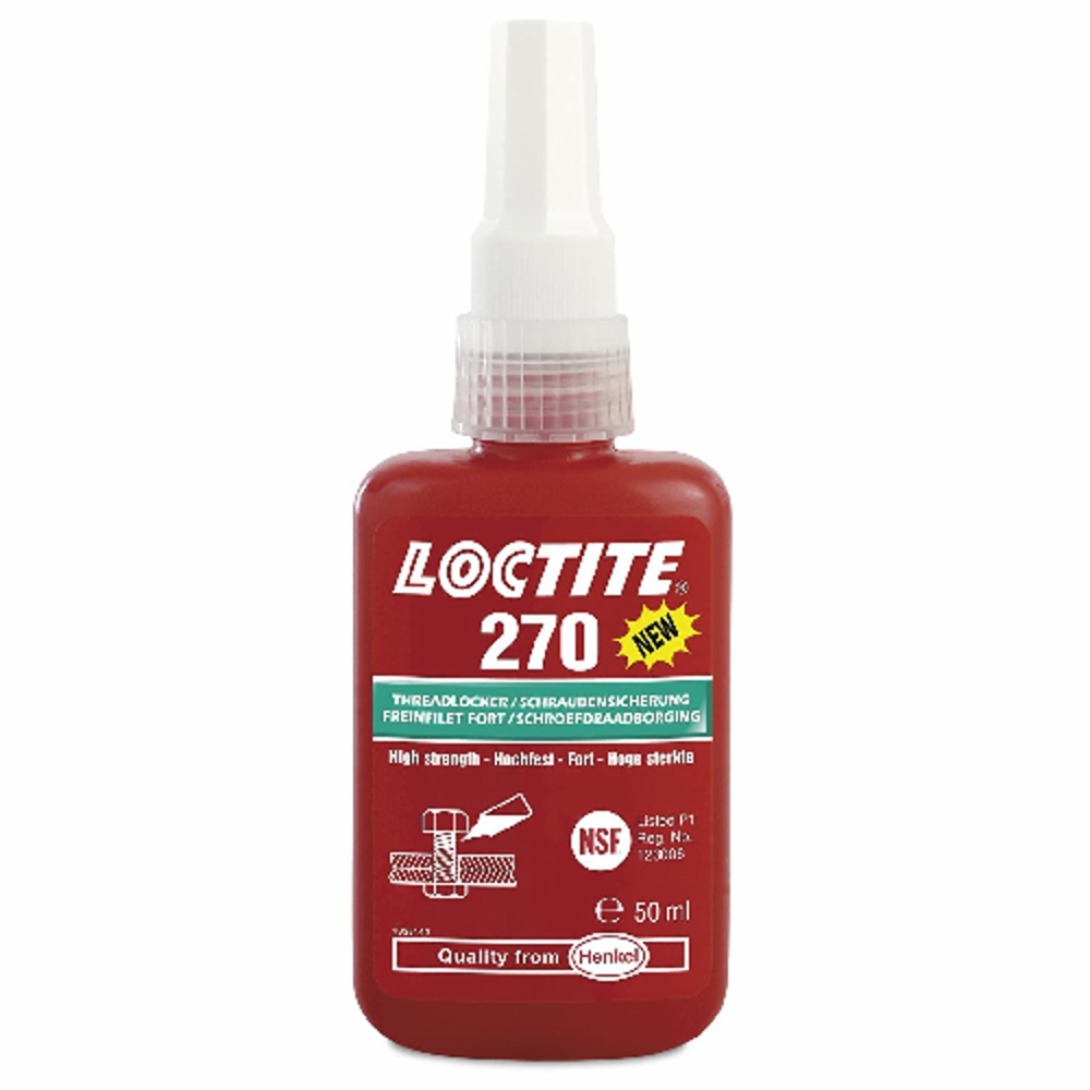 LOCTITE 270 es un fijador de roscas de alta resistencia de maxima eficacia, ideal para asegurar y sellar tornillos, tuercas y pernos evitando as el aflojamiento por vibracion. Recomendado para la fijacion permanente de montajes que no precisen desmontaje habitual. Apropiado para todas las tornilleras metalicas, incluidos sustratos pasivos como el acero inoxidable, aluminio y superficies galvanizadas. Tolera contaminaciones ligeras de aceites industriales, por ejemplo, aceites de motores, aceites anticorrosion y fluidos de corte. Se puede desmontar calentando la pieza a 300 C.