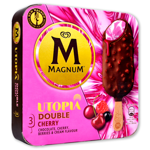 Helado de frutas del bosque veteado con helado sabor nata, recubierto de salsa de guinda (22%) y chocolate con leche (26%) con trocitos de caramelo sabor frutas del bosque (3,5%).