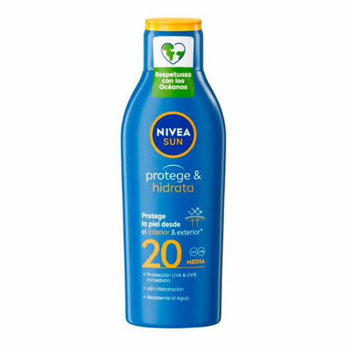 Nivea Sun hidratantes de leche sol F20. Nivea Sun nutritiva sol leche ofrece 100% resistente protección contra quemaduras de sol y anticipada piel envejecimiento. La fórmula de cuidado proporciona con el sistema eficaz para filtros UVA/UVB Protección fiable y la humedad capacidad de aspiración duradera. Cuanto más alto es el factor de protección (UVB), mayor será la correspondiente UVA de protección. Resistente al agua.