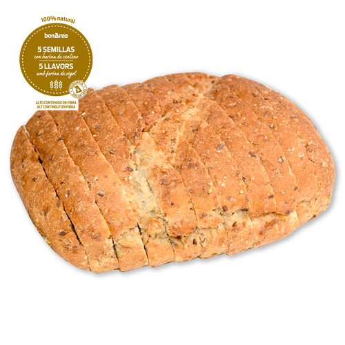 Sin conservantes, 100% natural y con un alto contenido en fibra, contiene semillas de sésamo, lino dorado, lino marrón, pipas de girasol y mijo pelado. Una vez salido del horno mantiene la textura durante 9 días conservado a temperatura ambiente o se puede congelar directamente con la bolsa y descongelarlo en la tostadora. Recomendamos consumirlo combinado con nuestra selección de embutidos y quesos bonÀrea. Este pan es el resultado de una doble fermentación, de un cuidado especial de la masa durante todo el proceso de elaboración y de un horneado simulando el efecto de la suela con piedra refractaria.