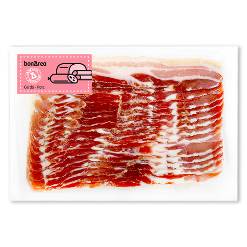 Producto curado elaborado con panceta de cerdo con corteza, condimentado con las correspondientes especias. Ideal para bocadillos, entremeses, salteado de verduras, huevos fritos y platos cocinados.