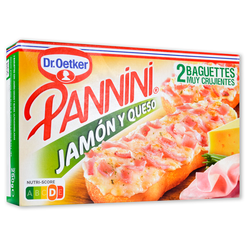 Contiene 2 baguettes. Pannini Jamon y queso de Dr.Oetker, una crujiente base de pan, cubierta con una deliciosa combinación de queso Edam, jamon cocido y cebolla crujiente. CONTIENE LECHE Y GLUTEN.