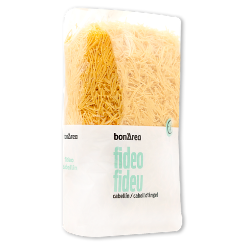 Pasta alimenticia seca de calidad superior de sémola de trigo duro 100% presentada en paquete termo sellado de 500 g. Perfecta para sopas o acompañada de nuestros caldos bonÀrea.