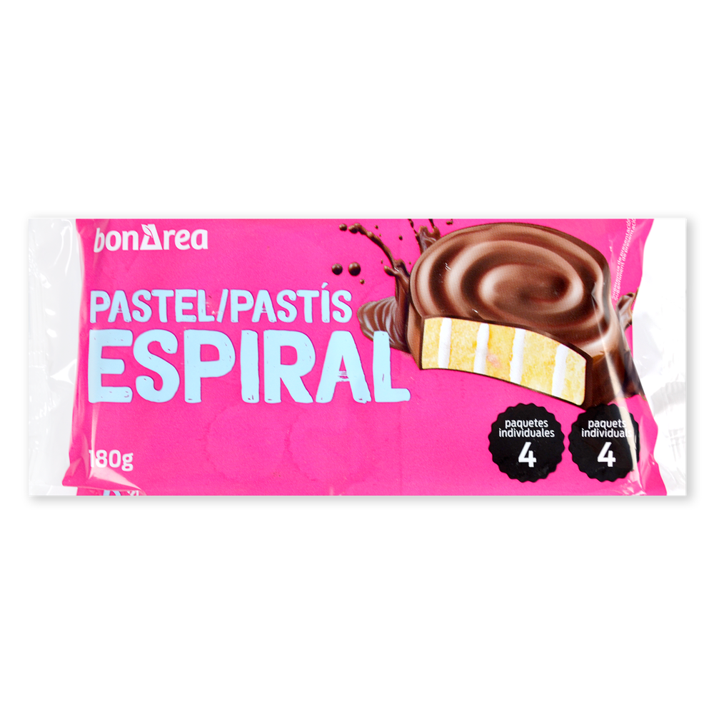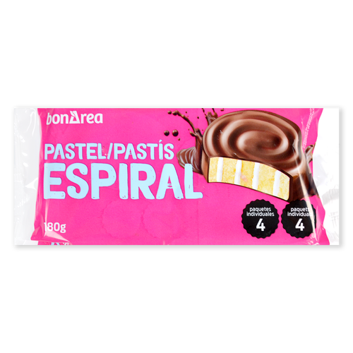 4 pastelitos en forma de espiral, envasados individualmente. Recuerda al tradicional bizcocho, bañado en cobertura de cacao. Ideal para llevar, para desayunos, meriendas, etc.