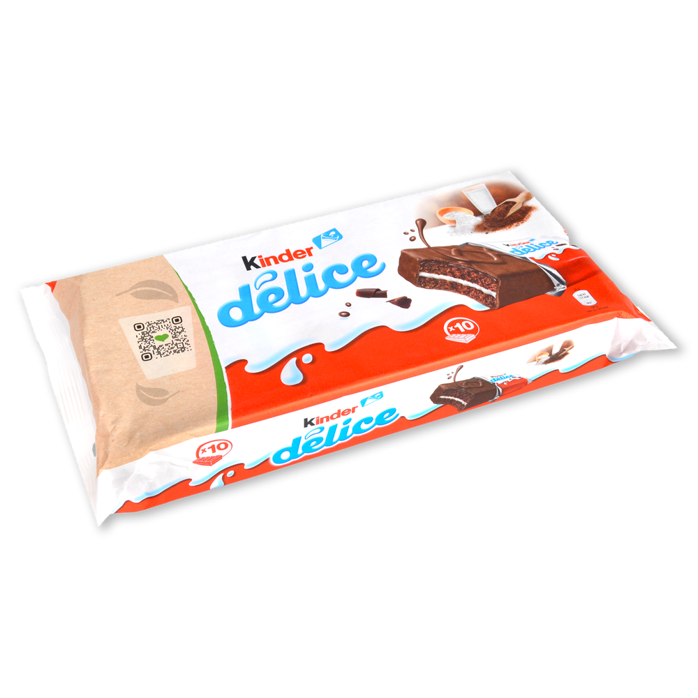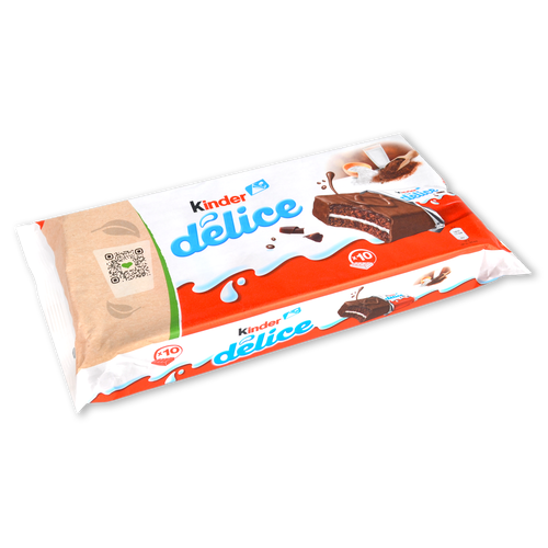 KINDER DÉLICE es un esponjoso bizcocho elaborado con leche y una fina cobertura de delicioso chocolate. Es la merienda que gusta a padres e hijos.Sin grasas hidrogenadas y sin colorantes.
