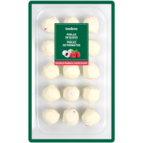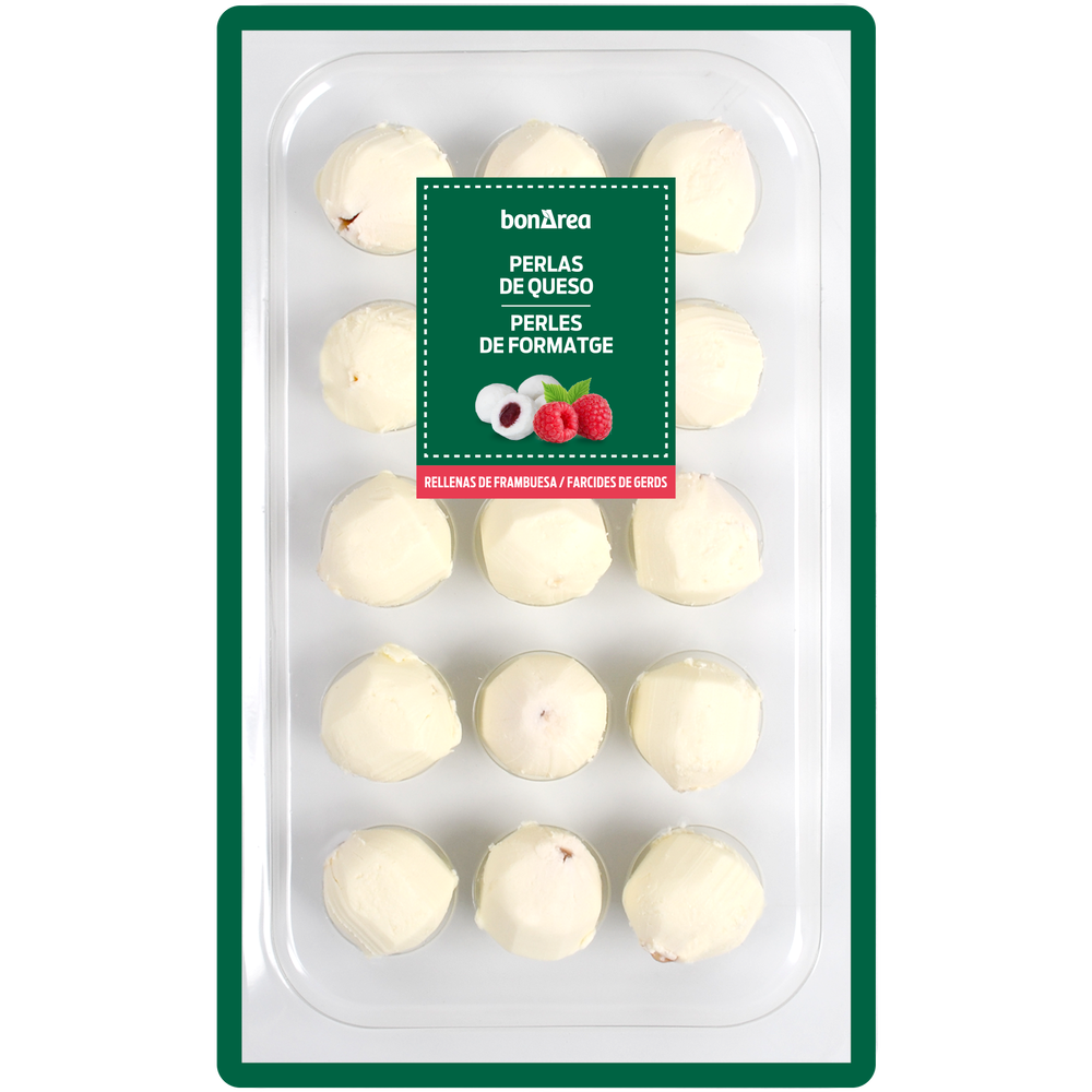 Aperitivo gourmet que se presenta en un envase de 125g. Estas perlas combinan la cremosidad del queso con el dulce sabor de las frambuesas, creando un bocado único.