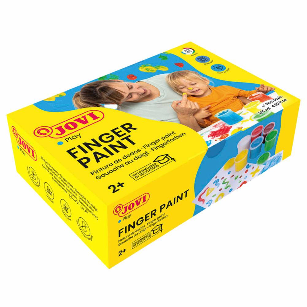 Caja con 6 botes de pintura de dedos Jovi, de 125 mililitros cada uno, en colores surtidos. Pintura de tacto agradable y, gracias a su composición, se puede lavar sin problemas.