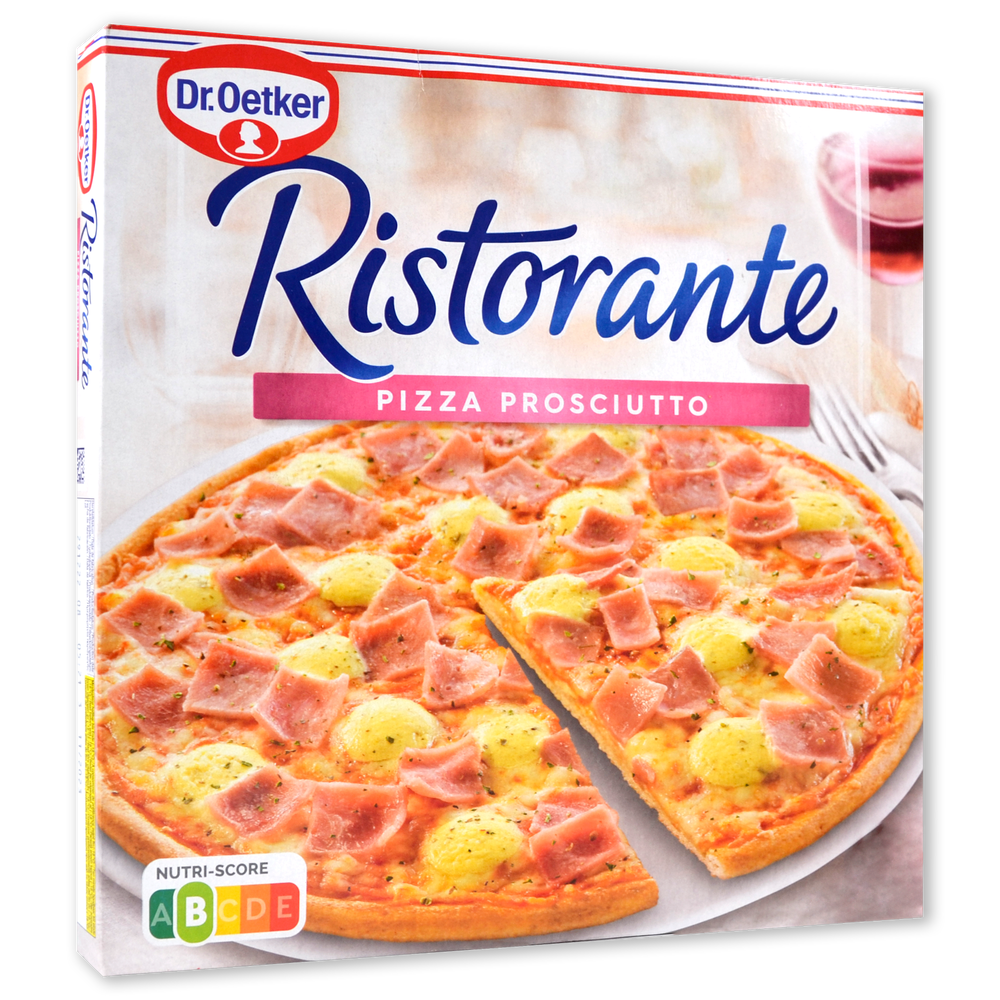 Pizza de Jamon y Queso. Ristorante de Dr. Oetker, una Pizza de masa fina y crujiente, es una Pizza con abundante jamón y suave queso, la Pizza prosciutto es la más clásica de la familia Ristorante, por esta razon puede gustar a niños y adultos. CONTIENE LECHE, HUEVO, GLUTEN Y SOJA.