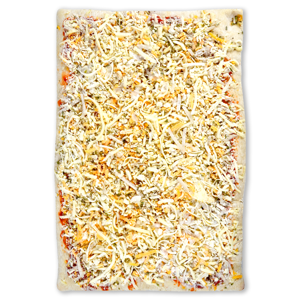 Base de pizza horneada en horno de piedra con guarnición de salsa de tomate, queso mozzarella, queso Gouda, queso azul fundido, queso cheddar, preparado lácteo y orégano.