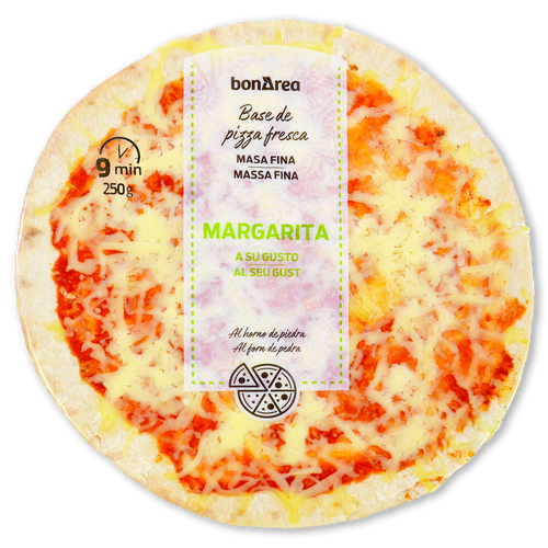Ingredientes base: harina de TRIGO, agua, aceite de girasol, sal, dextrosa, harina de CENTENO, levadura. Ingredientes guarnición: QUESO mozzarella (20 %) (LECHE pasteurizada de vaca, sal, fermentos lácteos y cuajo) y salsa tomate (18 %) (tomate concentrado (18 %) y acidulante: ácido cítrico), Puede contener trazas de HUEVO, SOJA, PESCADO, MOSTAZA, SULFITOS Y FRUTOS DE CÁSCARA.