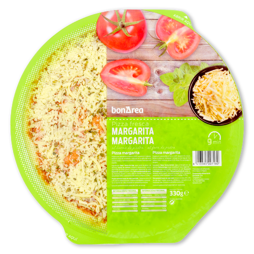 Precalentar el horno a 220 ºC durante 8-10 minutos. Retirar la pizza del envoltorio y colocarla en la rejilla del horno (altura media) y hornearla durante 8-10 minutos hasta que esté a su gusto. Una vez abierto el envase, conservar en el frigorifico y consumir en un máximo de 2 días.