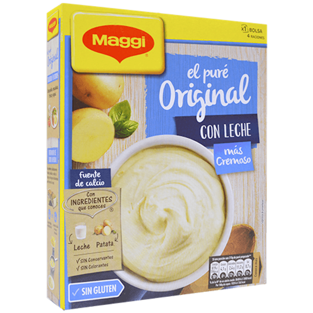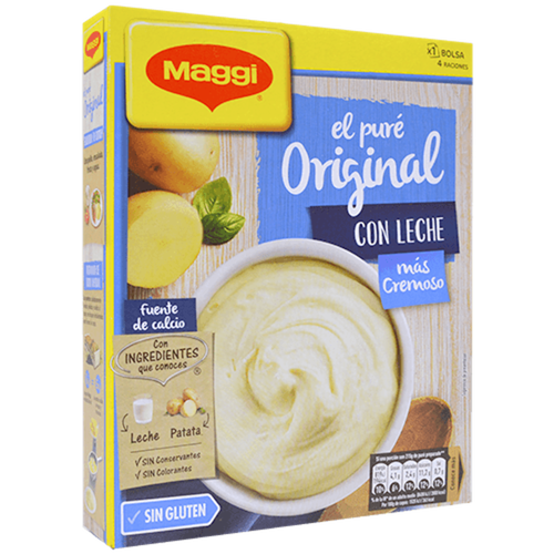 Disfruta del delicioso puré de patatas Maggi con leche que está elaborado con la mejor selección de variedades de patata. Una ración preparada con leche (115g de copos, 3/4L de leche semidesnatada y 2g de sal) proporciona un tercio de los valores de referencia de calcio. Una receta sin colorantes, ni conservantes.