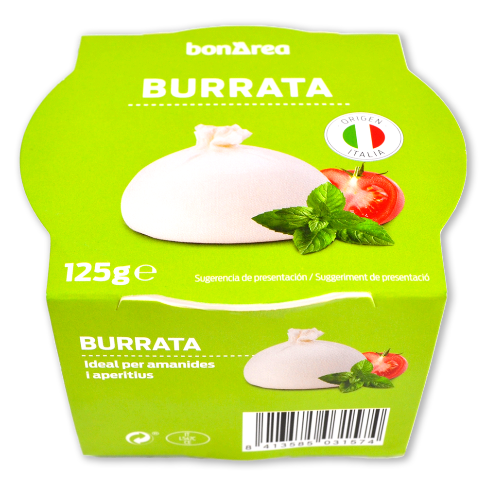 La burrata es un queso italiano que combina la cremosidad con la frescura de la mozzarella. Nuestra burrata BonÀrea se presenta en envases individuales de 125g. Su interior suave y relleno de crema lo hace perfecto para ensaladas, antipastos o como un elemento sorprendente en tus platos.