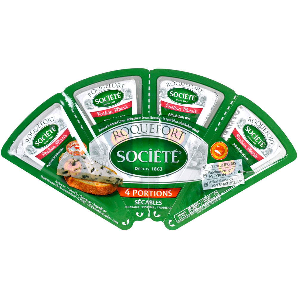 Uno de los iconos de la gastronomía francesa. Disfruta del mejor Roquefort DOP tanto en recetas cotidianas como en ocasiones especiales. Para multiplicar los momentos de placer, Société ha dividido su roquefort original en porciones. Este práctico formato permite disfrutar de este delicioso queso de textura cremosa y sabor intenso sólo o acompañado, como aperitivo o en la cocina, para alegría de los amantes del buen comer; grandes y pequeños. Envase con 4 porciones de 25 gr.