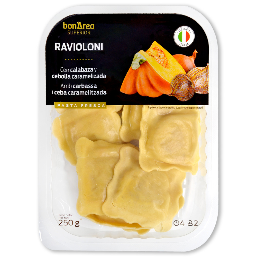 Ravioli de tamaño mas grande con una pasta rellena premium con un gran sabor y muy buena presentación. Este Ravioloni es una receta clásica del norte de Italia y una de las más apreciadas. Combina perfectamente con las distintas salsas bonArea.