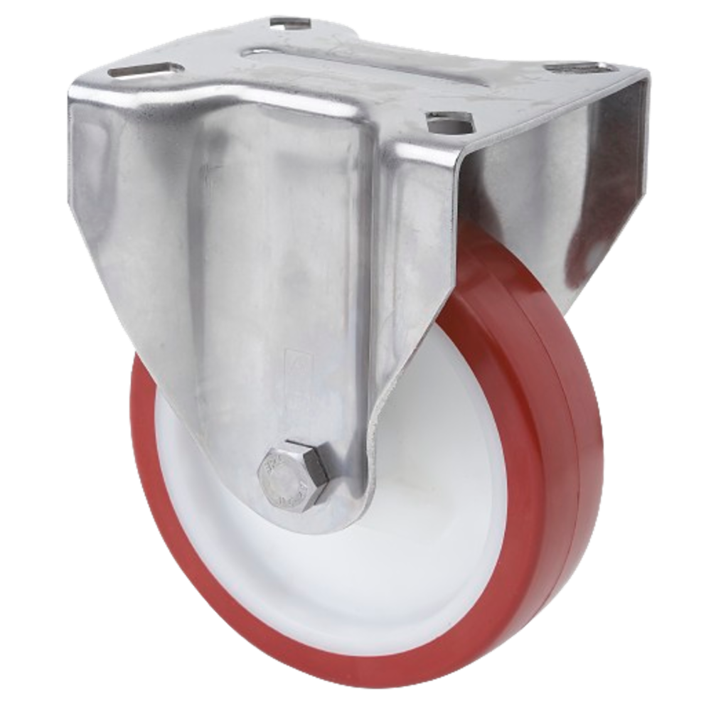 Ruedas de poliuretano inyectado con todos sus componentes de acero inoxidable (AISI 304). Especialmente indicada para soportar cargas hasta 300 Kg.