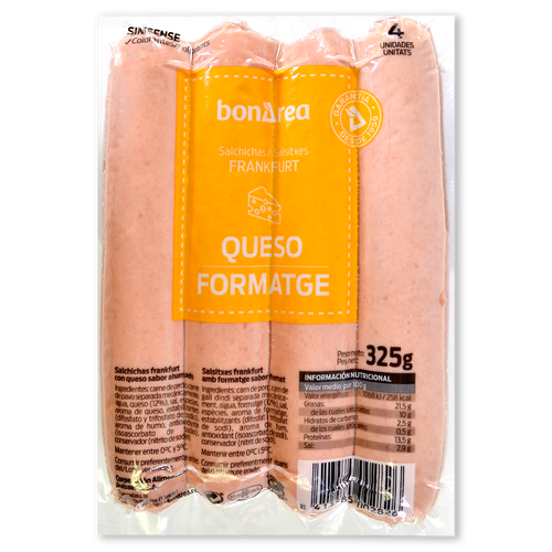 carne y grasa de cerdo, carne separada mecánicamente de pavo (27%), agua, QUESO (12%), sal, aromas, estabilizantes (tri- y difosfatos), aroma de humo, antioxidante (isoascorbato de sodio) y conservador (nitrito de sodio).
