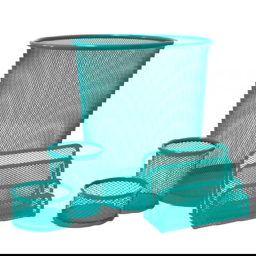 Juego de escritorio metálico de rejilla. Se compone de: Papelera, portacartas 3 compartimentos, cubilete y porta clips.