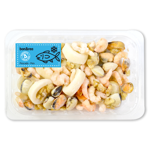 Mezcla de marisco y pescado (almeja c / valva, cola de gamba o langostino cocido, mejillón, anillas de pota y trozos de filete de merluza o almeja s / valva). Para acompañar en caldos de pescado y como preparado de sartenes mixtas.