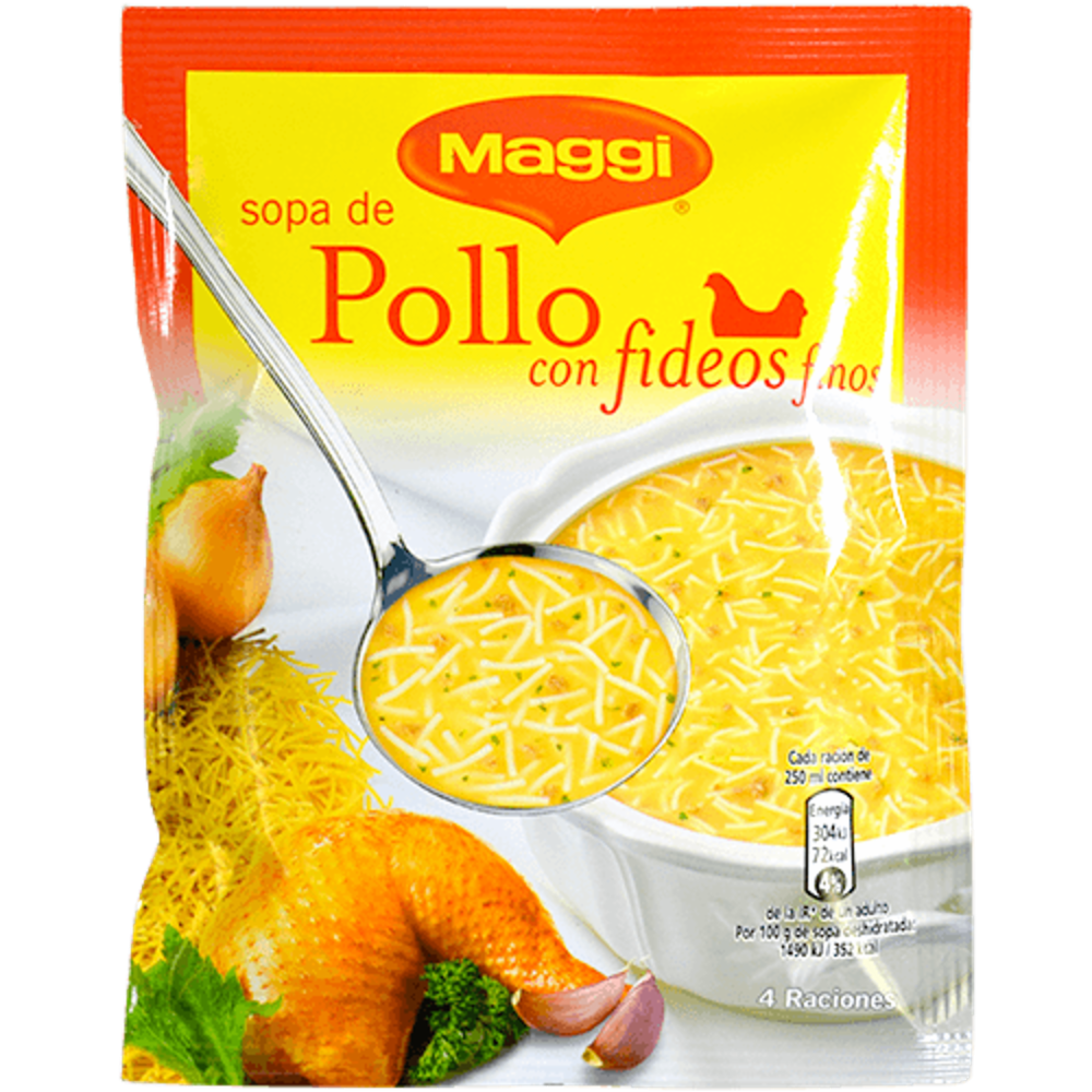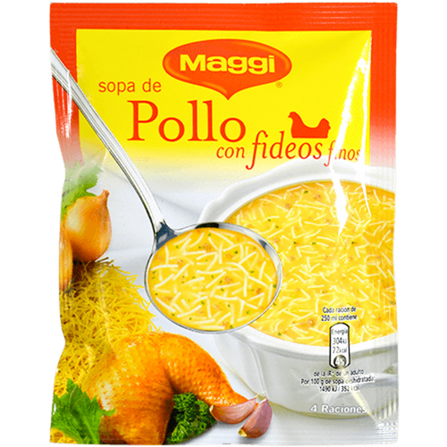 Deliciosa sopa de pollo instantánea con fideos finos elaborada con suave caldo y abundante pasta. El clásico e inconfundible sabor de la sopa Maggi no puede faltar en tu mesa. Un receta de cocina de rápida preparación con el que siempre acertarás. Sabrosa sopa de pollo elaborada con hortalizas deshidratadas como cebolla, ajo y perejil, que te permitirá disfrutar de un excelente caldo suave con fideos de manera fácil y limpia.