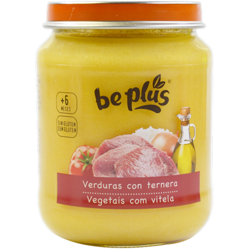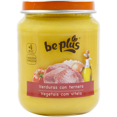 Alimento infantil. Puré de verduras con ternera y aceite de oliva virgen extra (1%).
