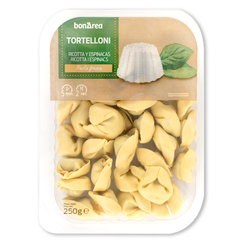 Producto fresco elaborado en base a los dos complementos principales: la pasta con sémola de trigo duro al huevo, el relleno de queso fresco y espinacas, se puede aliñar con queso rallado o combinar con las salsas bonÀrea como la salsa cuatro quesos, boloñesa o carbonara, o condimentar al gusto con aceite de oliva, mantequilla, queso rallado bonÀrea mozzarela, para fundir, en polvo o emmental, etc.