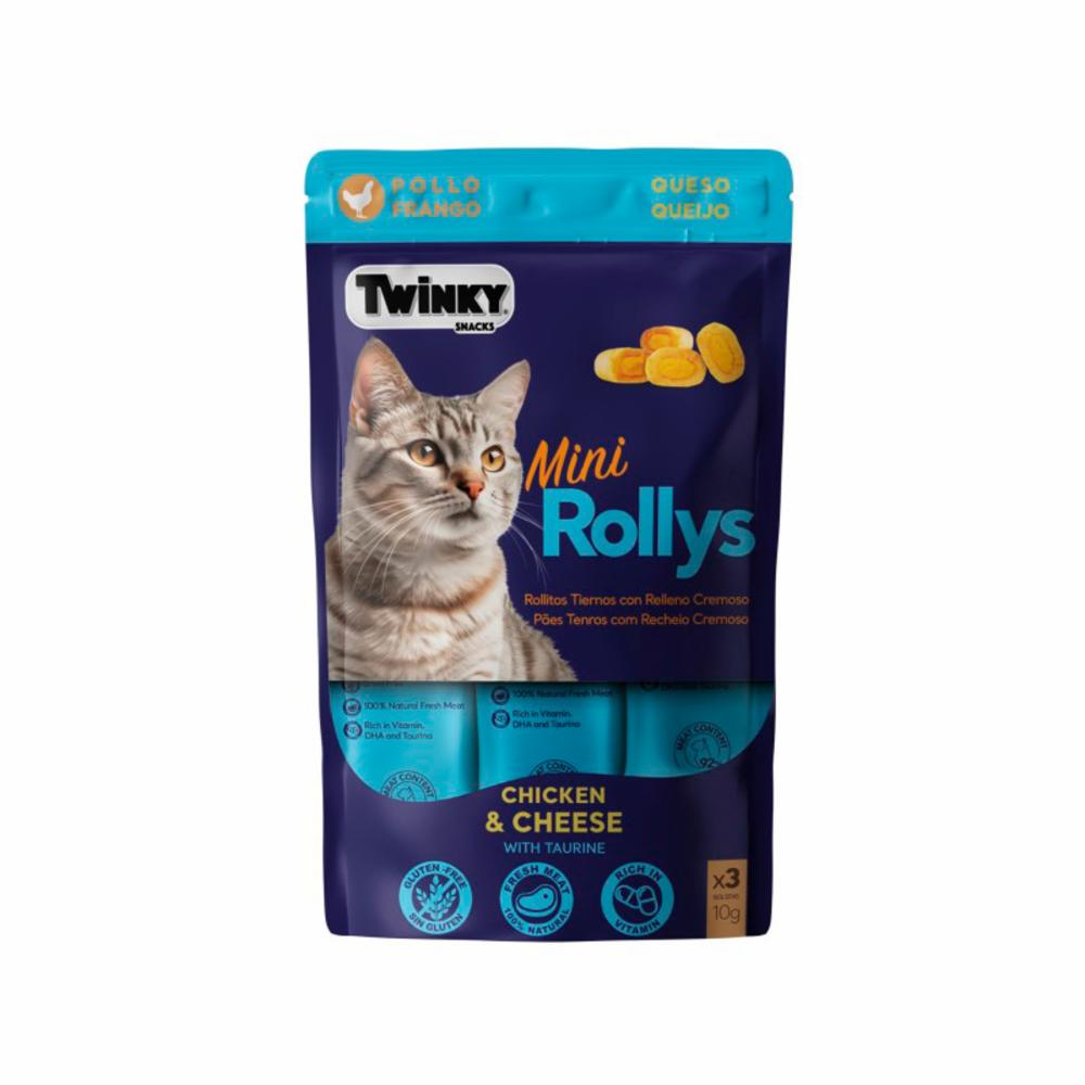 Los snacks mini rollys de Els Twinky son unos deliciosos rollitos suaves con relleno cremoso, elaborados con pollo y queso, pensados especialmente para cuidar la salud y el bienestar de tu gato. Cada paquete incluye 3 unidades de 10 gramos cada una, ideales para ofrecer como premio o como complemento a la dieta diaria.