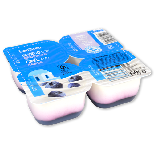 YOGUR NATURAL AL ESTILO GRIEGO AZUCARADO (80%) (LECHE FRESCA PASTEURIZADA DE VACA (73%), NATA PASTEURIZADA, azúcar (7,1%), LECHE DESNATADA EN POLVO, PROTEÍNAS DE LA LECHE y fermentos lácteos) y preparado de arándanos (20%) (arándanos (40%), agua, azúcar, jarabe de glucosa-fructosa, almidón modificado, acidulante (ácido cítrico), espesantes (pectinas y alginato sódico), aroma natural, corrector de la acidez (citrato trisódico) y colorante (antocianinas)). Origen de la leche: España.