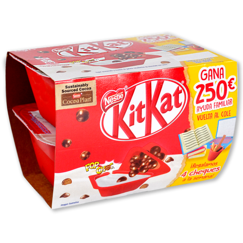 Yogur azucarado (82,6%): leche pasteurizada (70%), azúcar (6,6%), leche desnatada en polvo, nata, proteínas lácteas, fermentos lácteos. Trocitos de galleta recubiertos de chocolate con leche (17,4%): azúcar, harina de trigo, leche desnatada en polvo, manteca de cacao, grasas vegetales (palma, shea), cacao, cacao desgrasado en polvo, grasa láctea, gelificantes (goma arábiga, goma laca), emulgente (lecitina de girasol), gasificante (carbonatos de sodio). Puede contener cacahuete, frutos de cáscara, soja y sésamo.Sin colorantes. Sin conservantes. 70% leche. Importante: los niños pequeños (menores de 4 años) tienen una capacidad limitada de masticar y pueden atragantarse con porciones pequeñas de alimentos.
